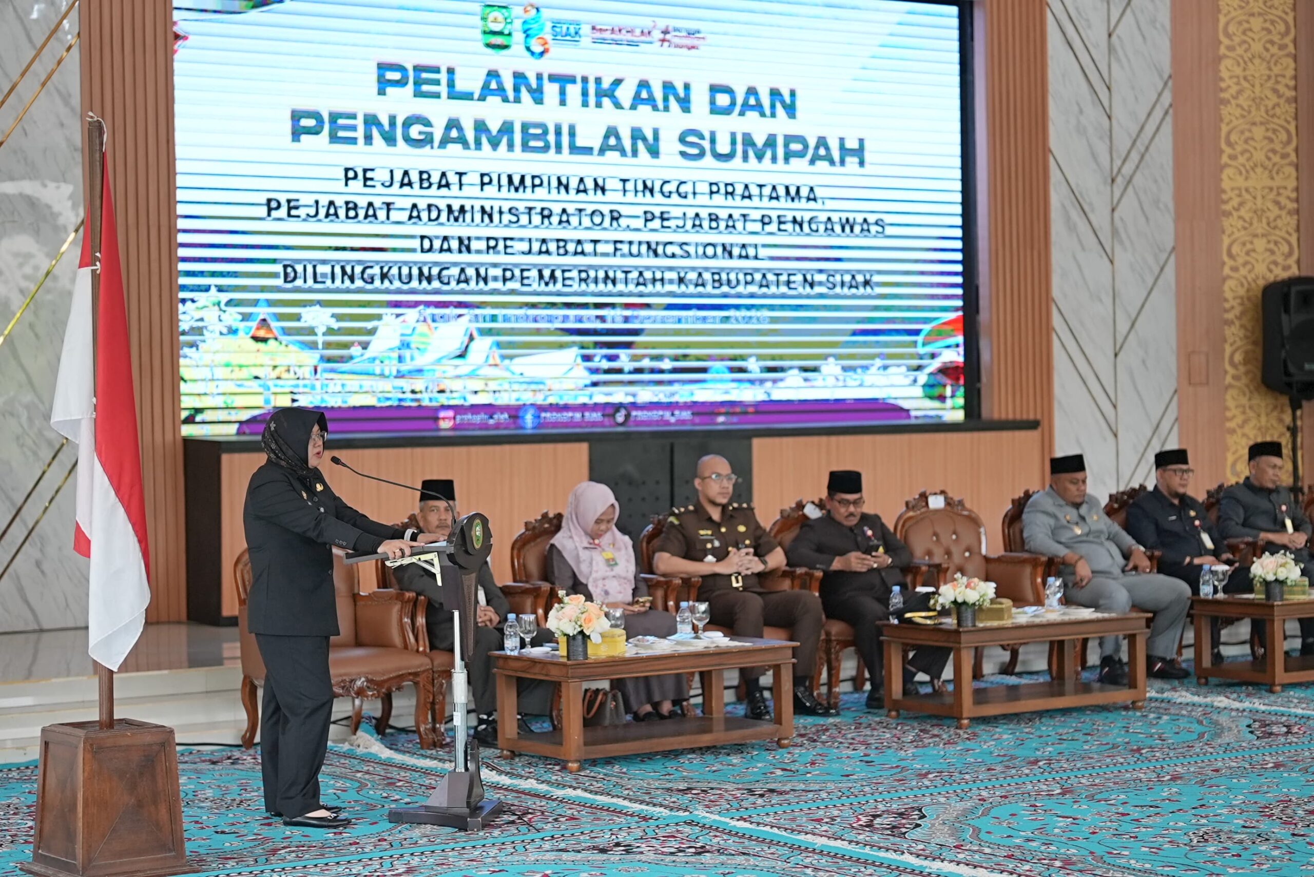 Keterangan Foto: Bupati Siak Dr. Afni Zulkifli menyampaikan arahan saat pelantikan dan pengambilan sumpah 71 pejabat eselon II, III, IV, serta pejabat fungsional di lingkungan Pemerintah Kabupaten Siak, yang digelar di Pendopo Datuk Empat Suku, Siak Sri Indrapura, Jumat (19/12/2025). Pelantikan ini menjadi perombakan birokrasi perdana setelah enam bulan kepemimpinan Bupati Afni, sebagai upaya penguatan kinerja dan pelayanan publik.