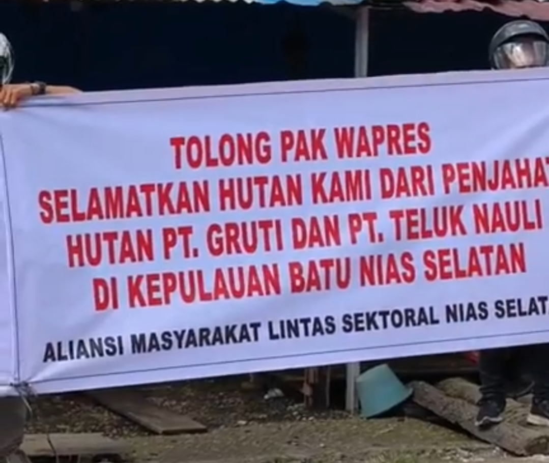 Adapun isi spanduk yang dibawa massa aksi antara lain bertuliskan, “Tutup PT Gruti dan PT Teluk Nauli yang beroperasi di Kabupaten Nias Selatan.” dan “PT Gruti dan PT Teluk Nauli telah merusak dan mencemari lingkungan di Kepulauan Batu Nias Selatan,” serta “Tolong Pak Wapres selamatkan hutan kami dari penjahat hutan PT Gruti dan PT Teluk Nauli di Kepulauan Batu Nias Selatan”.