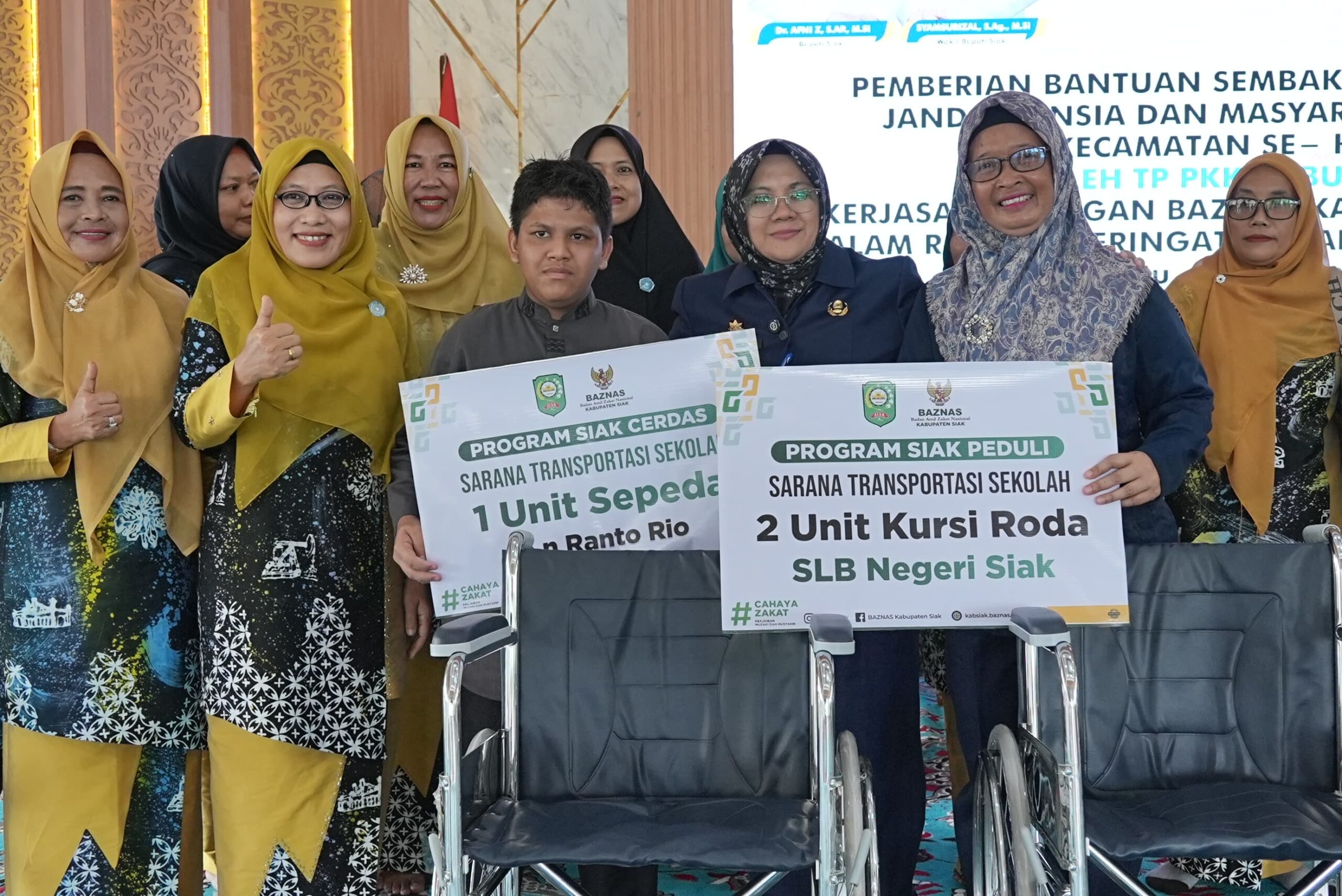 Dua unit kursi roda untuk siswa SLB Negeri Siak atas nama Reply Muhammad Harun dan Rifki Azriansah. Bantuan seragam sekolah geratis tingat SDN, SMPN ze Kabupaten Siak yang diproduksi oleh UMKM binaan BAZNAS Kabupaten Siak.