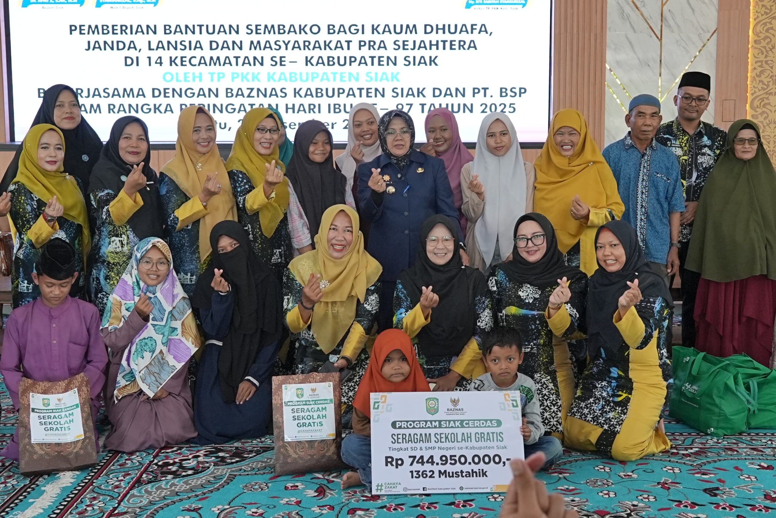 SIAK || Jidicialjustice.com – TP PKK Kabupaten Siak bersama BAZNAS Kabupaten Siak dan PT Bumi Siak Pusako menyalurkan bantuan sembako kepada kaum dhuafa, janda, lansia, serta masyarakat pra sejahtera di 14 kecamatan se-Kabupaten Siak.